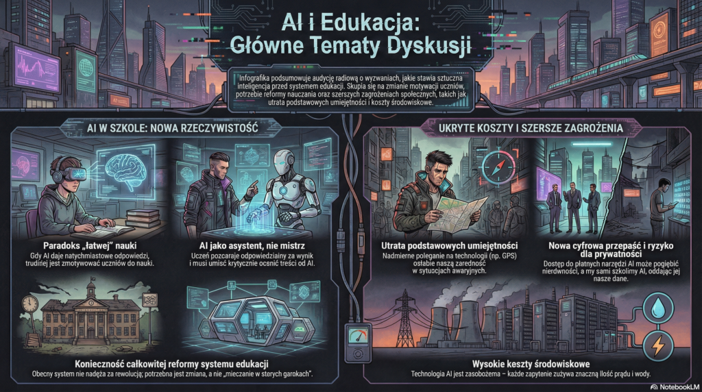 Przygotowałem także link do prezentacji z głównymi pytaniami, hasłami i tezami o których dyskutowaliśmy podczas spotkania. Z pomocą sztucznej inteligencji rzecz jasna. Slajdy wygenerowane zostały automatycznie w aplikacji NotebookLM od Google. Na podstawie transkrypcji naszej rozmowy. Zastosowałem w tym celu następujący prompt (polecenie):